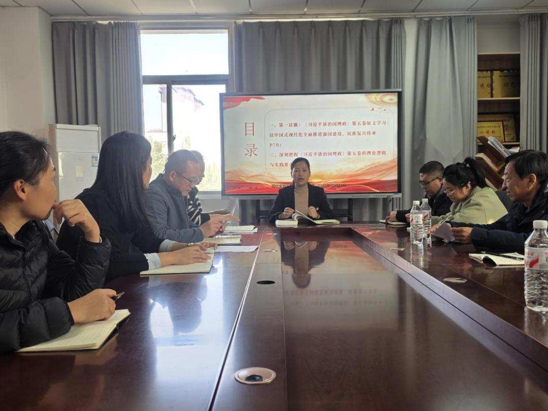 会上,梁艳领学第一议题《习近平谈治国理政》第五卷中“以中国式现代化全面推进强国建设、民族复兴伟业”原文内容。副院长高莉丽领学“深刻把握《习近平谈治国理政》第五卷的理论逻辑与实践要求”。