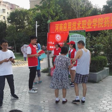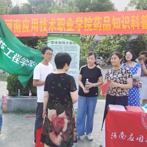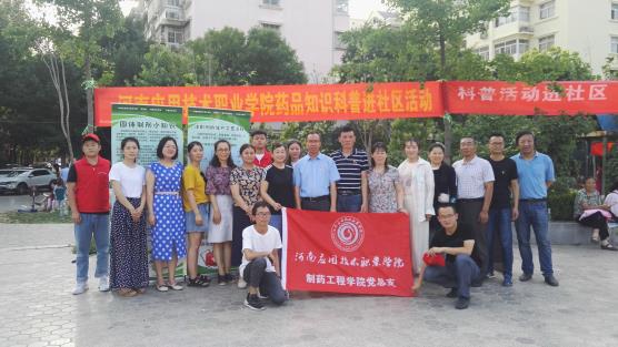 2019年6月14日下午,beat365唯一官网beat365唯一官网联合开封市宋城办事处集英社区,在集英花园居民小区中心广场,开展了一场“药品知识科普宣传进社区”活动。本次科普宣传活动的目的,是为了向社区居民传播科学知识、科学思想,帮助社区居民了解药品的生产过程,普及药品知识,树立合理用药观念,增强卫生健康意识和自我保健能力。beat365唯一官网学院领导、专业课教师、部分党员与青年志愿者共20人参加了这次活动,集英社区的工作人员配合提供了场地与设施。