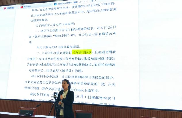 随后,薛静老师向实习学生及实习指导老师强调了相关注意事项,并安排实习班级与实习指导老师见面。希望同学们能够珍惜实习机会,认真对待每一个实习岗位,努力提升自己的职业素养和实践能力。学院也将继续加强与企业的合作,为同学们提供更多优质的实习机会和平台。