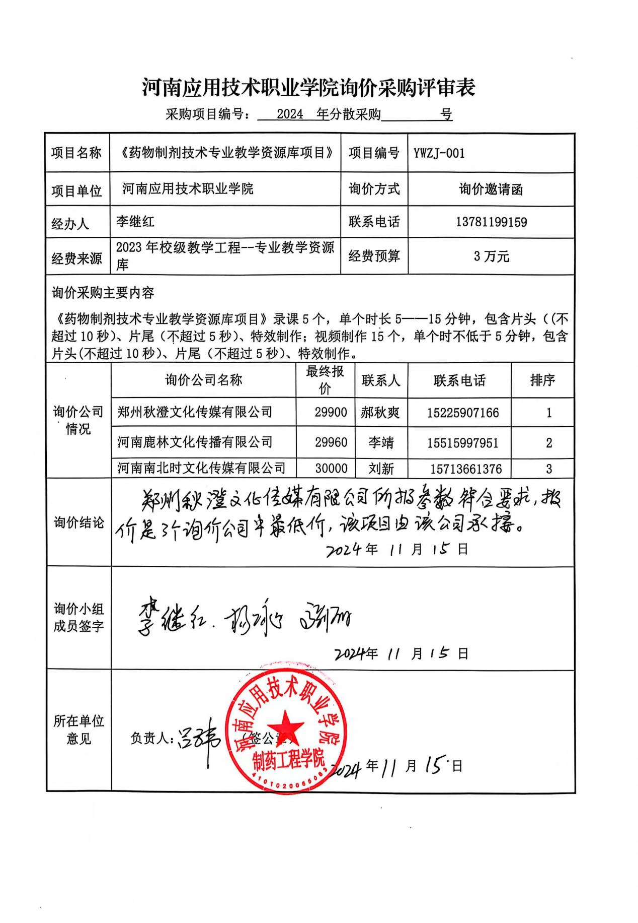 beat365唯一官网“药物制剂技术专业教学资源库项目,于2024年11月15日15: 00(北京时间),在beat365唯一官网开封校区(南院)301室,按照学校询价文件的规定,对3家供应商的响应文件进行了评审,现对评审结果进行公示。