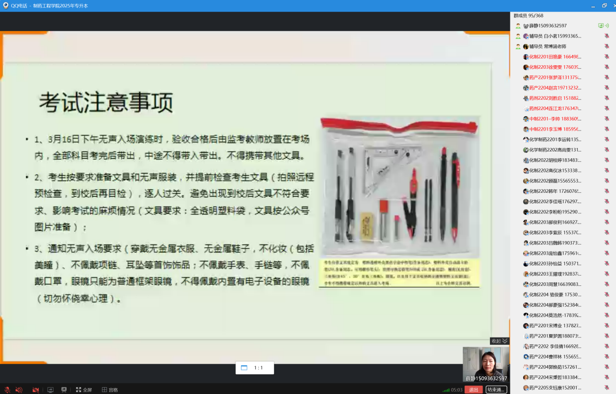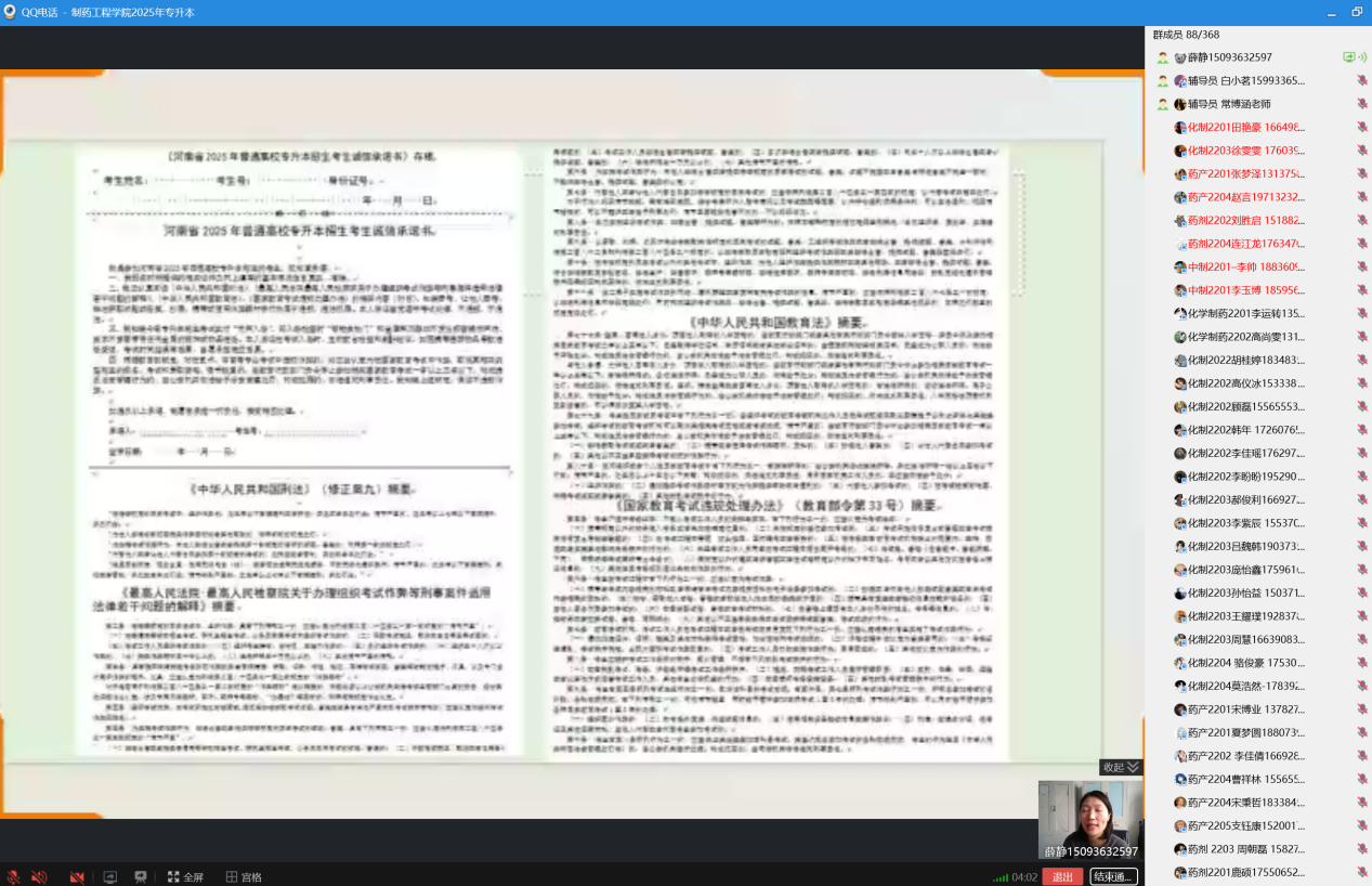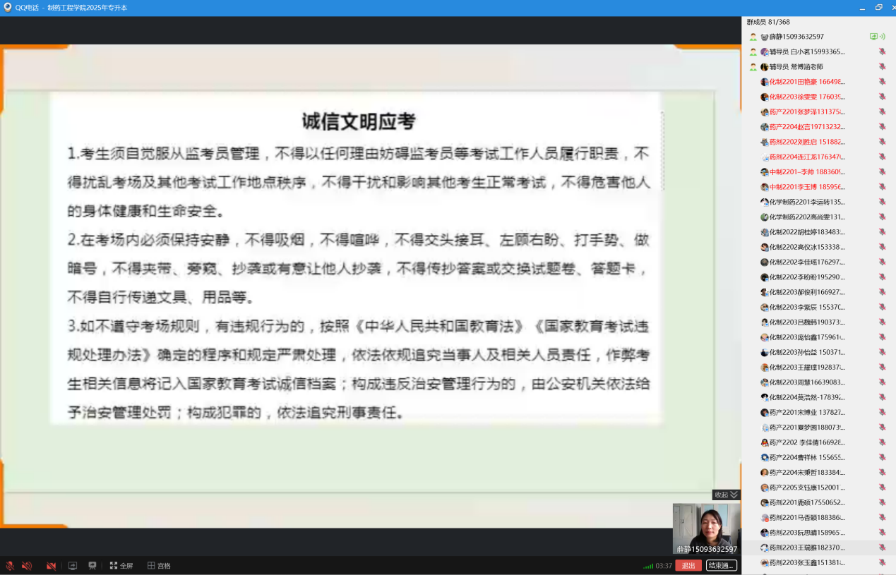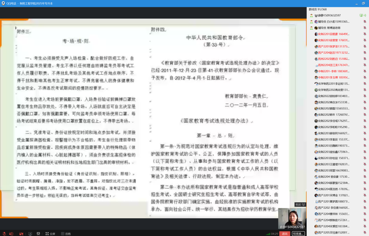 班会通过网络会议进行。同学们共同观看了《中华人民共和国刑法修正案(九)》、《中华人民共和国教育法》、《国家教育违规处理办法》警示教育片和“无声入场”模拟演练宣传片,认真学习考试纪律要求。薛静从“诚信做人”和法律法规来教育学生认识诚信考试的重要性,提高自身的道德水平修养,崇尚“诚信”,远离虚伪、欺诈行为发生。最后,薛静贴心提醒学生考试注意事项,同时鼓励全体考生要放平心态、端正态度、认真备考,做好考前的复习,抓住最后的冲刺时间,取得理想成绩。
