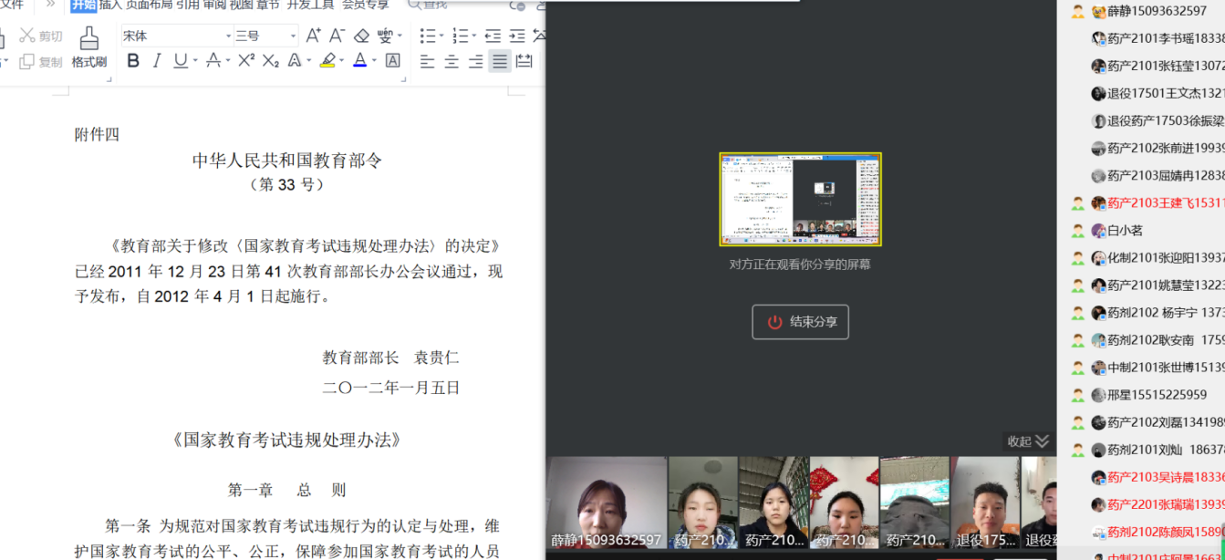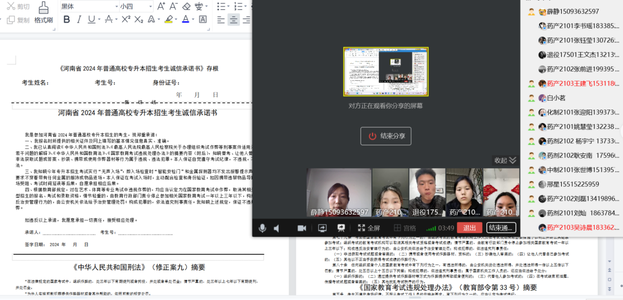班会通过网络会议进行,薛静组织同学们观看《刑法修正案(九)》、《教育法》、《国家教育违规处理办法》警示教育片和“无声入场”模拟演练宣传片,认真学习考试纪律要求。从“诚信做人”和法律法规来教育学生认识诚信考试的重要性,提高自身的道德水平修养,崇尚“诚信”,远离虚伪、欺诈行为发生。最后,组织考生签写《河南省2024年普通高校专升本招生考生诚信承诺书》,同时鼓励全体考生要放平心态、端正态度、认真备考,做好考前的复习,抓住最后的冲刺时间,取得理想成绩。
