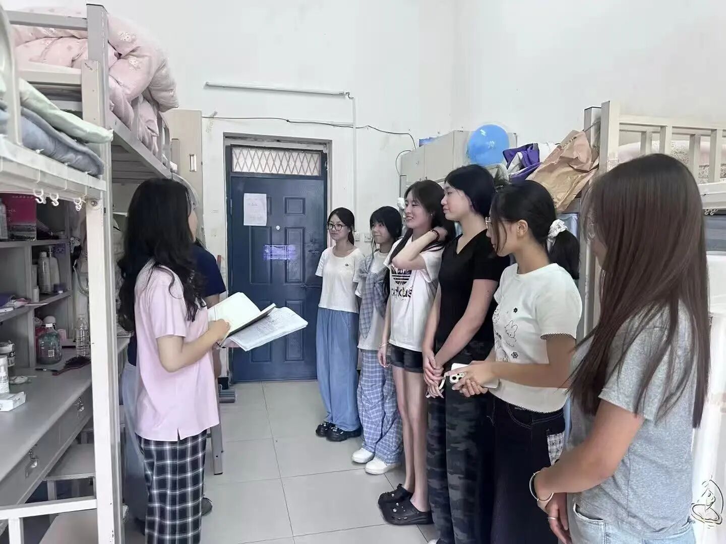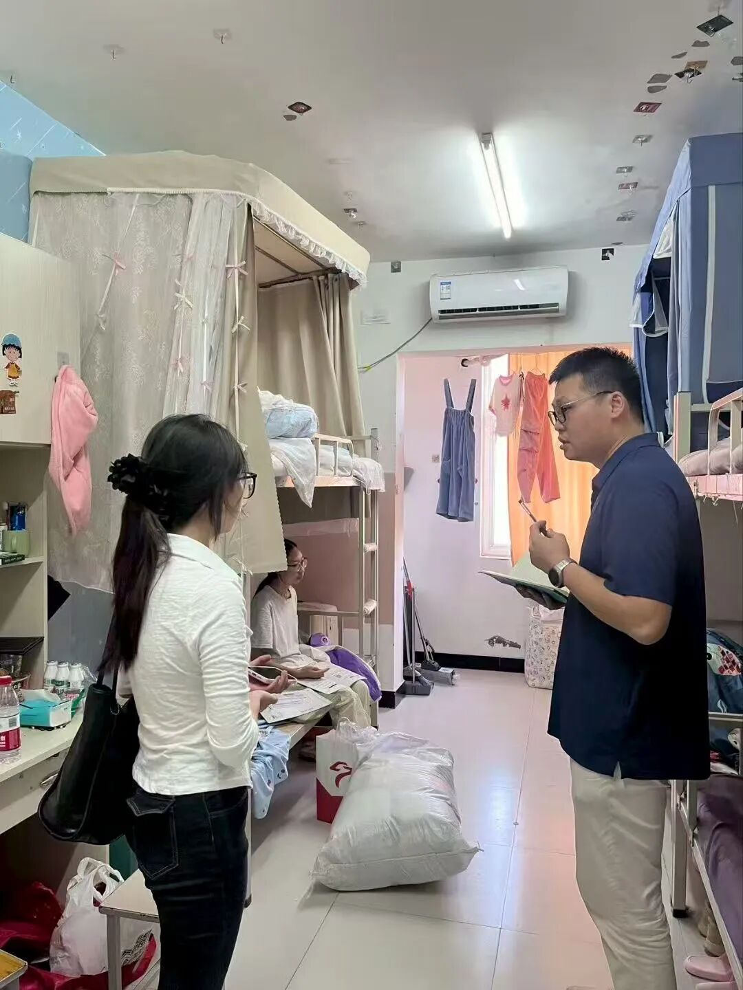 班会结束后,辅导员们深入新生宿舍,开展“暖心查寝”活动。每到一间宿舍,辅导员都与学生亲切交谈,仔细查看宿舍卫生状况,叮嘱学生注意宿舍用电规范,禁止使用违规电器。同时,辅导员耐心倾听新生在生活适应、宿舍关系等方面遇到的问题,现场协调解决宿舍设施故障、生活用品采购等实际需求,并鼓励新生互帮互助、团结友爱,共同营造安全、和谐、温馨的“第二个家”。一句句贴心的叮嘱、一次次耐心的解答,让初入校园的新生感受到了学院的关怀与温暖,有效缓解了他们的思乡之情与入学焦虑。