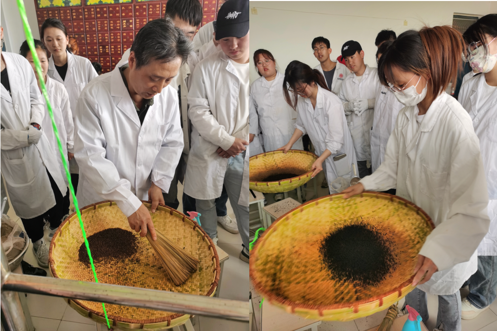 在现场指导体验时,李军强为师生展示“手工泛丸”中药传统技艺,他以水为媒,仅凭人力,将细密的药粉变为数以万计的微小丸粒。并指导师生用此传统方法制备了六味地黄丸。