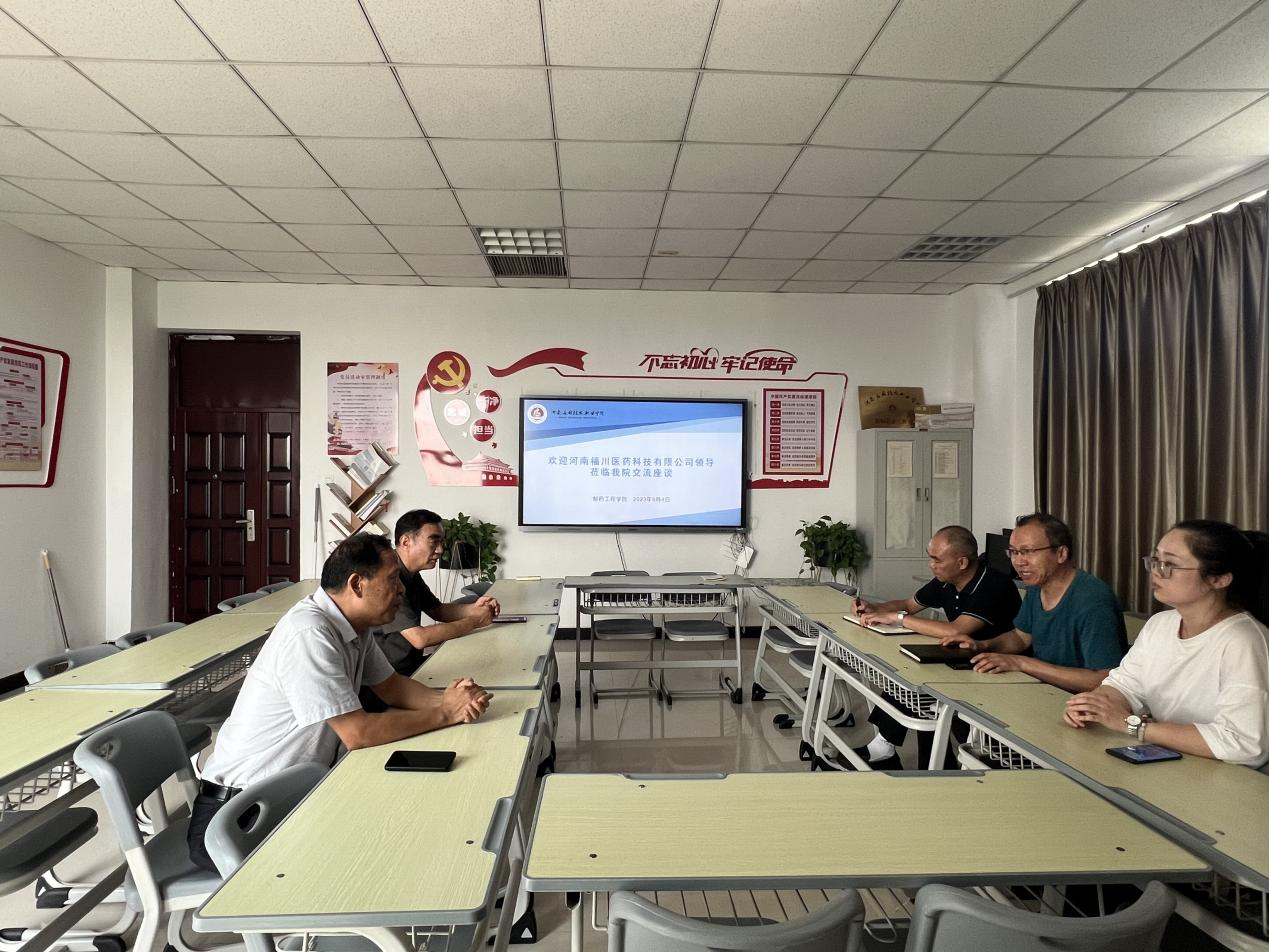 窦传斌代表学院对冯全新一行的到来表示热烈欢迎,并介绍了学校及学院的发展情况、专业设置、学生实习就业等基本情况。冯全新介绍了河南福川医药科技有限公司的基本情况、主要业务范围和与其他企业合作开展项目的情况,并说明了公司用人招聘计划。
