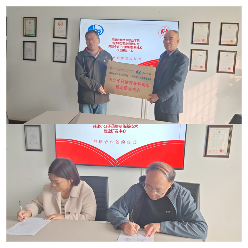 为实施高校人才与产业发展深度融合,更好地服务区域经济发展,10月30日,beat365唯一官网与开封明仁药业有限公司举行共建小分子药物制备新技术校企研发中心战略合作签约仪式。beat365唯一官网党总支书记窦传斌、院长吕玮、党政办主任孙高磊、开封明仁药业有限公司总裁王新房,行政副总朱登敏等参加签约仪式。