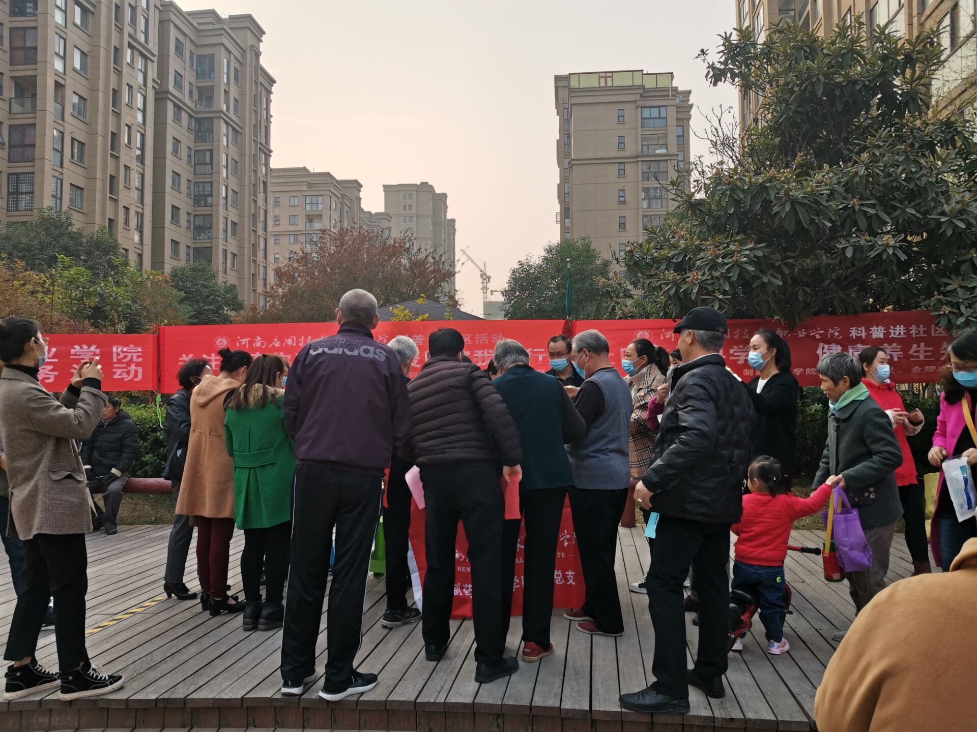 11月13日下午3点,在鼎立社区广场科普活动人员已经投入工作当中,悬挂了“关注健康你我他防疫防控我先行”等横幅,布置了“秋冬季疫情防控不放松个人防护这些方面要注意”“新冠肺炎使用药物简介”等展板。活动中,专业教师和学生志愿者们一边为辖区居民发放“用药小常识"宣传单、《秋冬季健康防护指南》宣传册,一边为居民们讲解如何注意秋冬季防疫防控个人防护注意事项,用药常识等内容,居民们听的非常仔细,志愿者们还耐心解答居民们提出的问题。