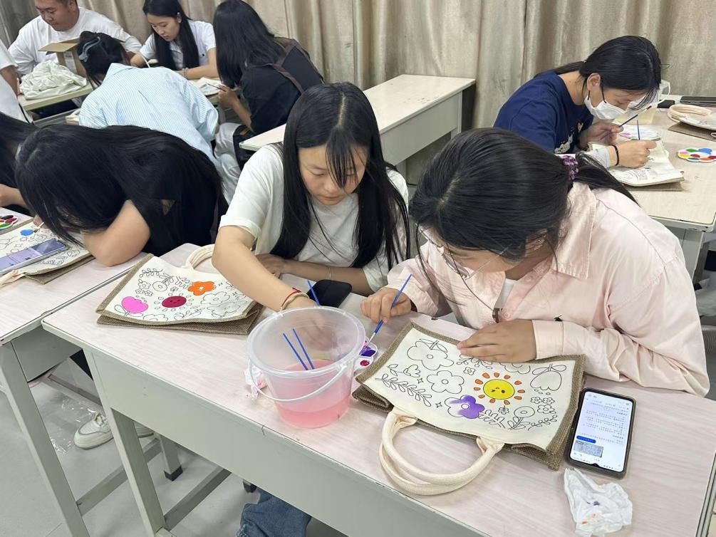 活动现场,“手绘心情,包纳美好”主题背景板与简洁明快的创作区布置,传递出“用色彩对话心灵”的核心理念。学院心理专员黄靖涵在开场环节强调:“手工创作不仅是艺术表达,更是与自我对话的过程。”鼓励同学们通过色彩与线条表达内心情绪。随后,同学们分组领取材料,围绕“压力释放”“美好校园”“未来期许”等主题展开创作。
